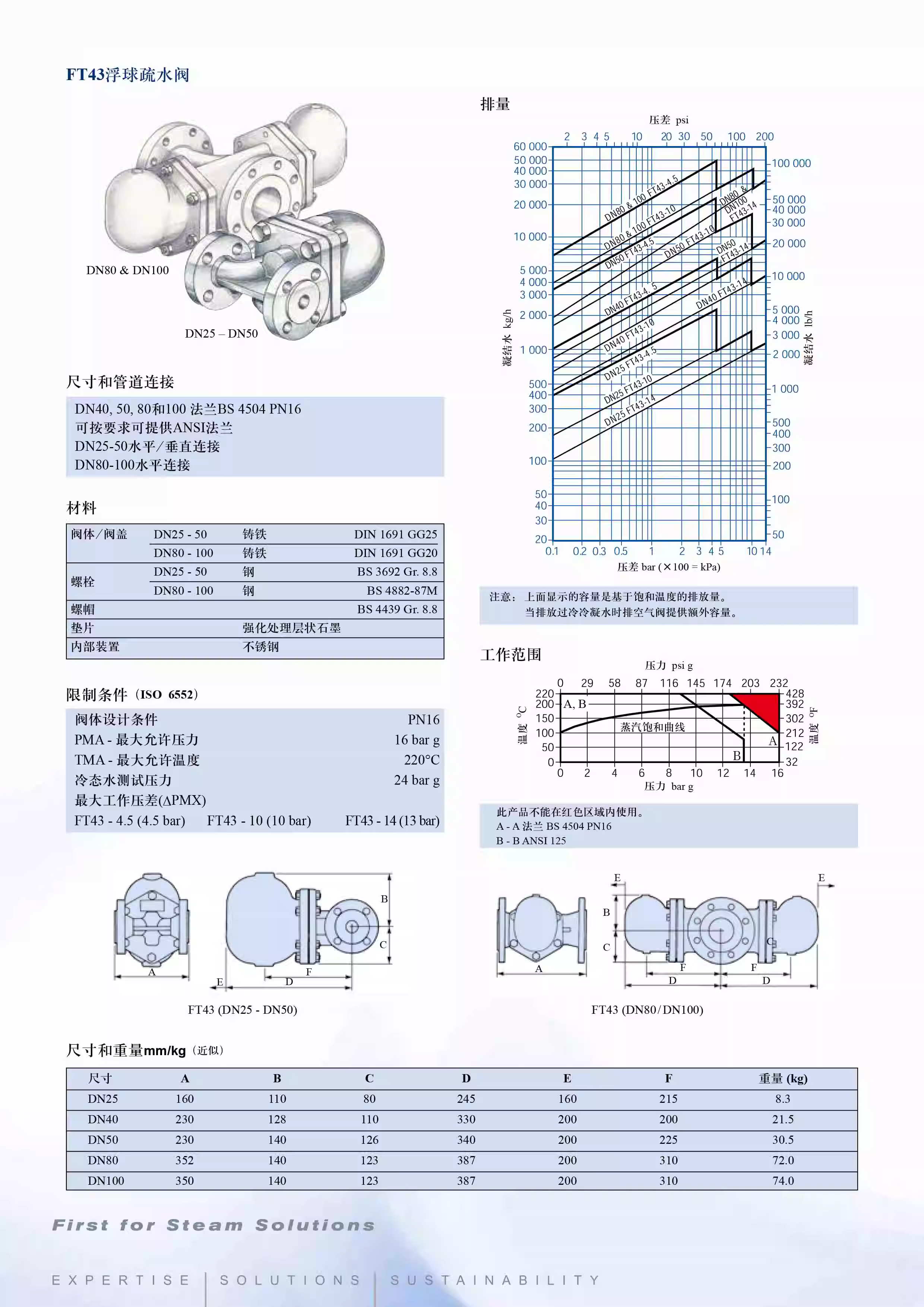 斯派莎克FT43-10疏水阀,铸铁原料浮球式疏水阀,不锈钢内部件,内置自动排空气阀设备。水平设备,法兰联接,也可提供垂直设备的FT43V,可在线修补,不用拆开管道。还有手动调度针阀可供选择,用于破蒸汽汽锁,类型为FT43-C。根据需要可在阀盖上开3/8“BSP”或NPT螺纹孔,用于设备排放阀。